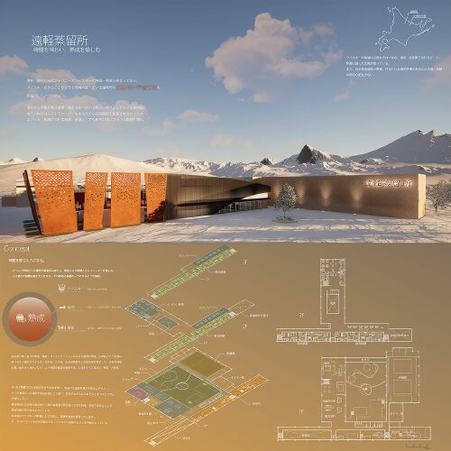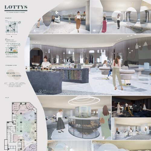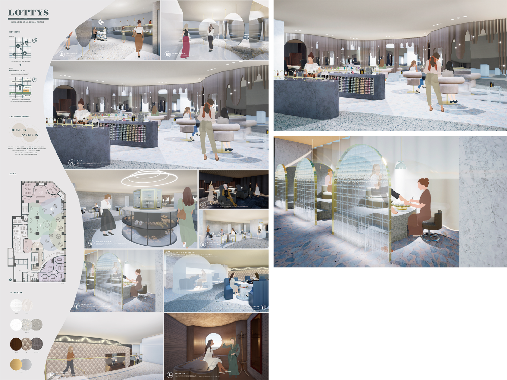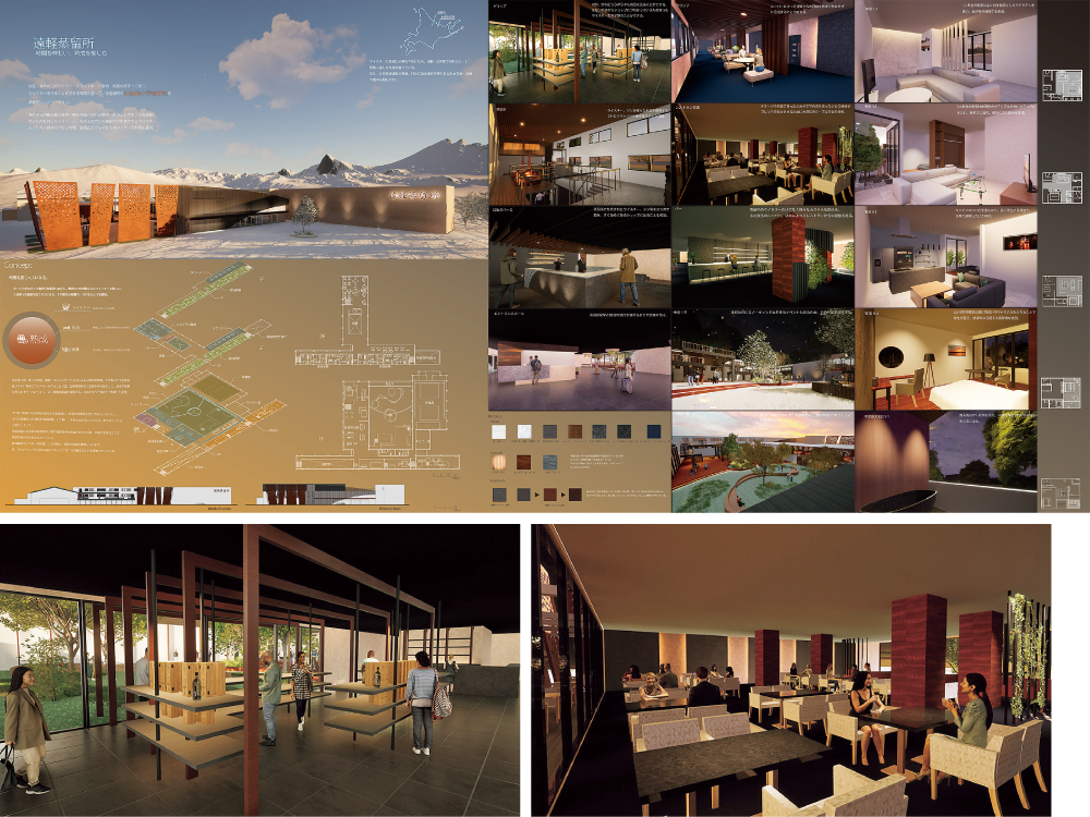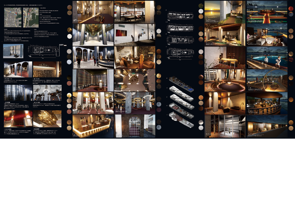 既存シティホテルの改修課題。実際の物件を対象に現地視察を行い周辺状況の確認から課題条件を読み解き、各自で課題対象範囲に対してテナントの設定とインテリアの提案を行う。