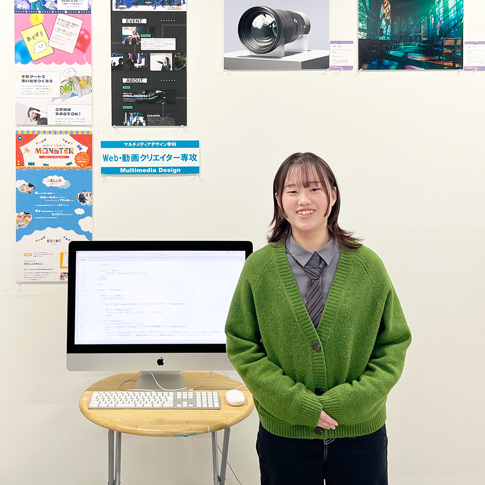 オープンキャンパスに参加したとき、先生や学生の雰囲気が良く、楽しく学べそうだと思いbisenへの入学を決めました。将来はWeb系の仕事に進めたらいいなと思っています。入学前はパソコンにほとんど触れたことがありませんでしたが、現在は必要なソフトを使いながら課題に取り組めるように。実際に手を動かしながら、制作を通して学ぶことでより理解が深まると感じています。心がけているのは、見る人にとって分かりやすいサイト設計や構成にすること。試行錯誤しながら作品をより良くしていくことに、やりがいを感じています。