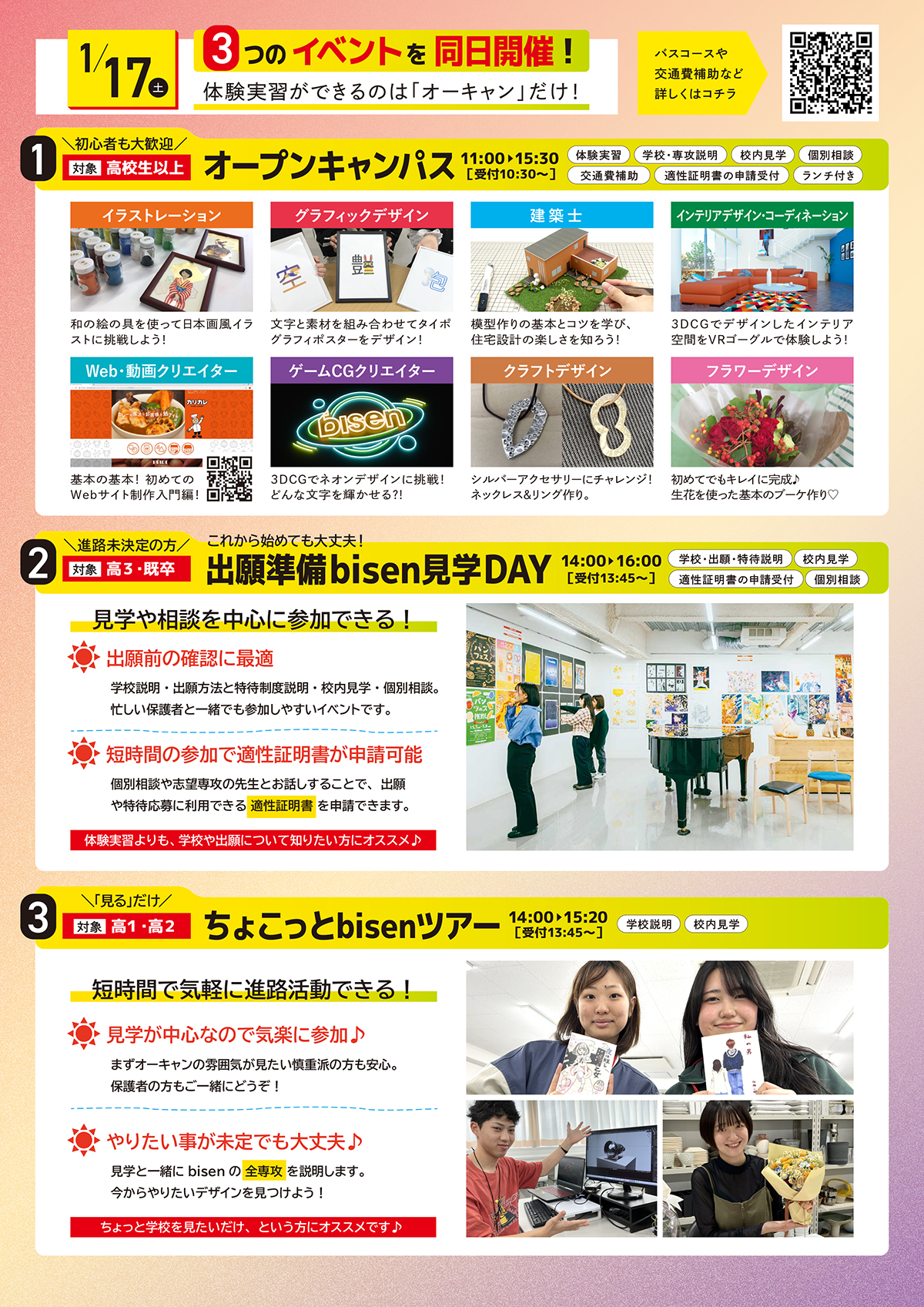 bisenの授業体験ができるオープンキャンパスをはじめ、学校やデザインの仕事について知ることができる6種類のイベントを開催しています。