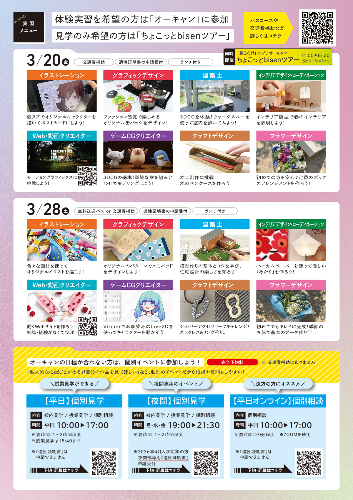 bisenのオープンキャンパスは、実際に授業を体験できます。先生や先輩がサポートしてくれるので、初めての方やおひとりでも安心です。 「先生はどんな人?」「どんなことを学んでいるの?」「デザインの仕事を具体的に知りたい!」など、実際にその目で確かめてみませんか? 実習メニューは毎回変わるので、何度参加してもOK!